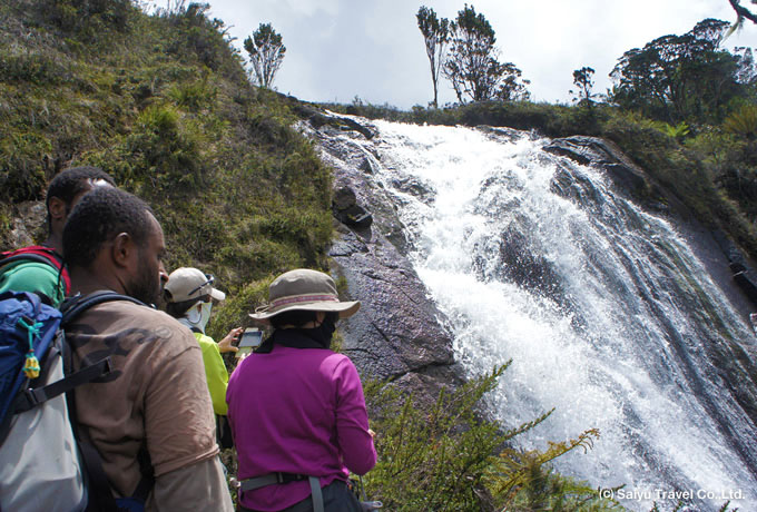 約6時間 | ●ピウンデ湖畔へ(約6時間) 朝、登山ガイド、ポーターと合流し登山開始。ジャングルを抜け草原を歩き、ピウンデ湖(3,550m)から流れ落ちる滝のそばを過ぎると、ピウンデ湖畔に到着。 山小屋又はテント泊
