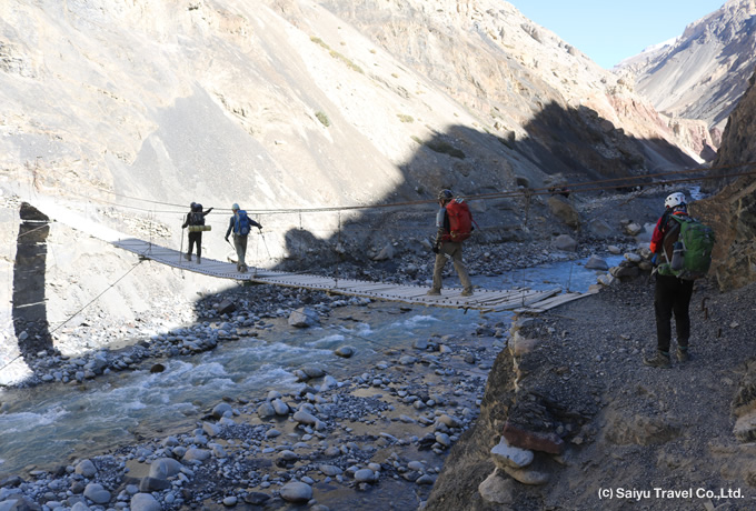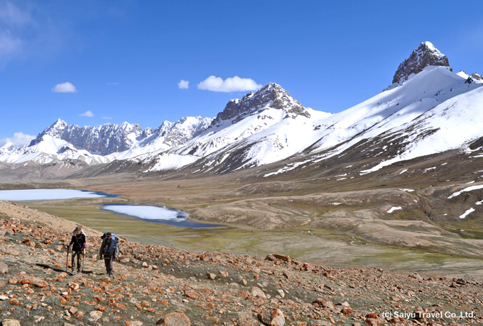 | トレッキングについて | 長期間に及ぶトレッキングです。トレッキング中は村や店が一切なく同日数のネパールトレッキングと比べてもより過酷な環境です。ルートはシムシャールの人々が放牧のためにヤクやその他の家畜を連れて歩いてきた道を歩きます。しかし、川沿いの高度感のある崖道、岩場など、決して足場が良いとはいえません。長期間のテント泊を過ごし、足場の悪いトレイルを連続して歩くことのできる、十分な体力が必要な健脚向きのコースで、ミングリク・サールを登頂しない方を除き、冬山登山の経験がある方が対象です。緊急時は軍のヘリコプターを要請する事になり時間がかかります。大事に至らぬ前に体調不良の方はガイドと添乗員の判断でグループから離団し、下山をしていただく事があります。また、トレイルやキャンプ地の状況、天候、皆様の体調により、トレッキングの日程を変更させていただくことがあります。 |