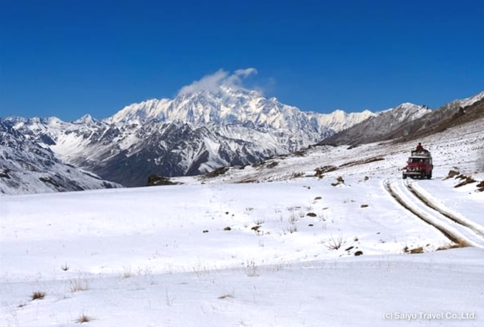 専用車にてクンジュラブ峠(4,693m)へ。運が良ければ、ヒマラヤアイベックスなどの野生動物と出会えるかもしれません。クンジュラブ国立公園での冬景色をご満喫ください。凍結状況によっては、凍った川にも立ってみましょう。その後、カリマバードへ戻ります。