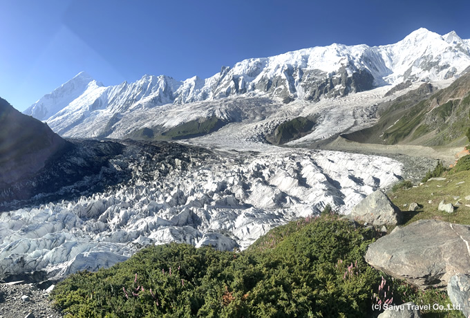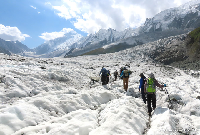 連泊するラカポシBCのすぐ傍らには、真っ白に輝くミナピン氷河が流れています。氷河トレッキングは世界中どこでも厳しい制限が設けられがちですが、本ツアーでは比較的歩きやすい箇所を気軽に歩き、美しい氷上の世界をお楽しみいただきます。