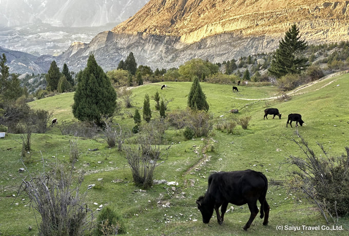 ●ラカポシB.C.トレッキング(約5時間) 往路をミナピン村まで下り、専用車にてフンザの中心地カリマバードへ。午後は、終日自由行動。ラカポシやディラン、ウルタル等、角度によって姿を変えた7,000m峰の姿もお楽しみください。 カリマバード泊