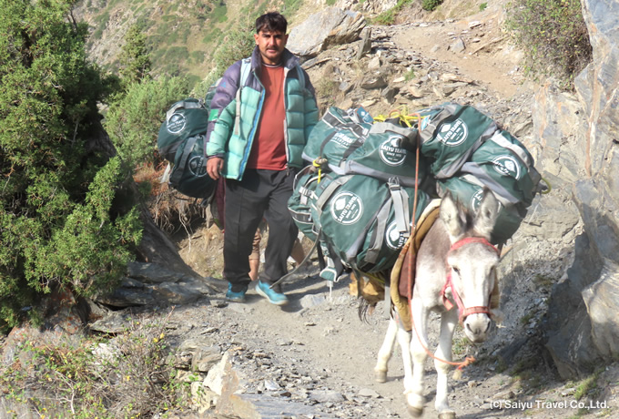 | トレッキングについて | 1日目は約900mの登り、2日目は約1,400mの下りがあります。部分的に斜度が急な場所もありますが、普段から家畜の放牧などで村人達が通る歩きやすいトレイルを半日行程でゆっくりと登ります。 |