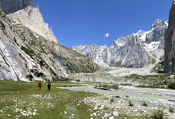 「パキスタンのヨセミテ」とも呼ばれるナングマバレーへ。カプルーの村を出るとカラコルム岩峰群が姿を現し、フーシェ谷の奥を目指します。目の前に岩峰を仰ぐキャンプ地で2連泊するトレッキングをお楽しみいただきます。