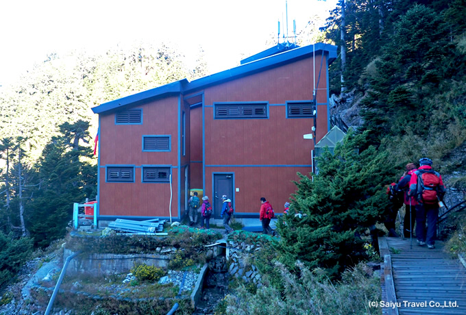海底からせり上がった一枚岩「大峭壁」を越えて更に約1時間。ようやく林の間の山小屋、排雲山荘(3,402m)が見えてきます。一日の宿泊者数が制限されているため、スペースはしっかり確保されています。登頂に備え早めにお休みください。