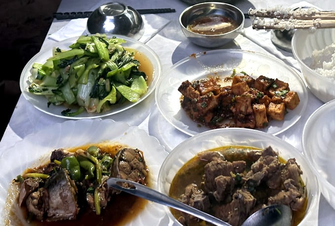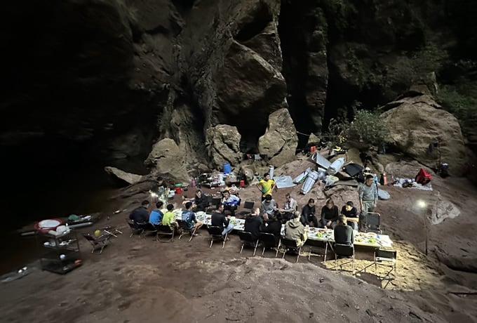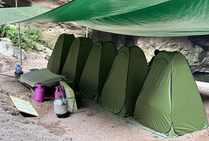 洞窟内では、ポーターが宿泊用テント(190cm×230cm/相部屋テントも共通)、トイレテントを設営します。寝具は夏用寝袋(無料)とマットが備えられていますので、ご自身で持参する必要はありません。飲用水は現地で流れる水を煮沸してお配りします。また、各キャンプ地ではシャワーとサウナの設備もご用意いたします。食事は、お湯を使って作るご飯や麺類、他にお野菜やお肉・魚を使った料理を提供いたします。昼食はお弁当をご用意して、お客様に運搬していただきます。ゴミは各キャンプ地にて回収いたします。