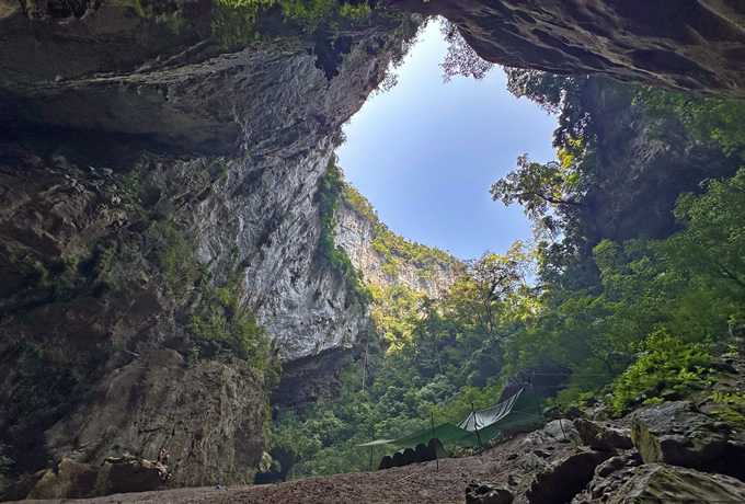 専用車にて、フォンニャ・ケバン国立公園のフォンニャへ。着後、ガイドと合流して洞窟内の事前説明を受けます。その後、専用車にてトレッキングのスタート地点へ(約30分)。 ●フォンニャ・ケバン洞窟トレッキング 着後、トレッキング開始。原生林を抜けて洞窟の入口を目指します(約4時間)。 ダイアー洞窟に到着後、水着やラッシュガードに着替えて、ライフジャケットやヘッドライトを着用。水中を泳いで、世界で最も深い陥没穴の一つであるコング 陥没穴へ(約40分)。 この日は陥没穴の中でテント泊となります。着後、宿泊テントに荷物を置いて、周辺を見学。 ※泳ぐのが苦手な方は筏で移動が可能です。 ※キャンプ地では、サウナやシャワーお楽しみいただき、ゆっくりとお過ごしいただけます。 テント泊