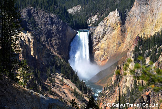 終日、イエローストーン国立公園の観光。色鮮やかな温泉が湧き出るウエスト・サム、泥のような温泉が湧き出るマッド・ボルケーノ、バッファローなど野生動物が多く棲息するヘイデンバレー地区、壮大な滝と渓谷が広がるキャニオン地区などを訪問。キャニオン地区では、ルックアウト・ポイント、アーティスト・ポイント、ブリンク・オブ・ローワー・フォールス・トレイルの展望デッキから迫力のローワー滝がお楽しみいただけます。 | ウエストイエローストーン:イエローストーンロッジ泊 |