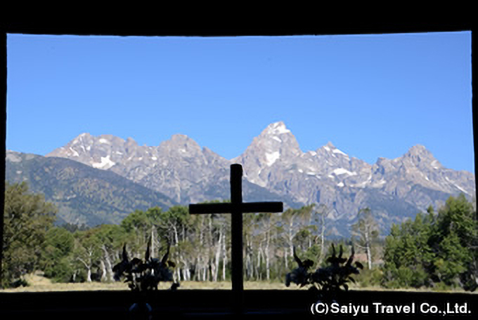 早朝、朝日に照らされたグランドティトンの展望をお楽しみください。朝食後、再びグランドティトン国立公園の観光。スネークリバー展望台、オックスボウベンド、映画「シェーン」の舞台ともなったアンテロープフラットロード、トランスフィグレーション礼拝堂などの展望地を巡り、グランドティトンの雄姿をご覧いただきます。午後、フェリーでジェニーレイクの対岸へと渡りインスピレーション・ポイントまでのハイキング(往復約2時間)をお楽しみいただきます。 | ジャクソン:49er クオリティ・イン泊 |