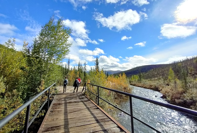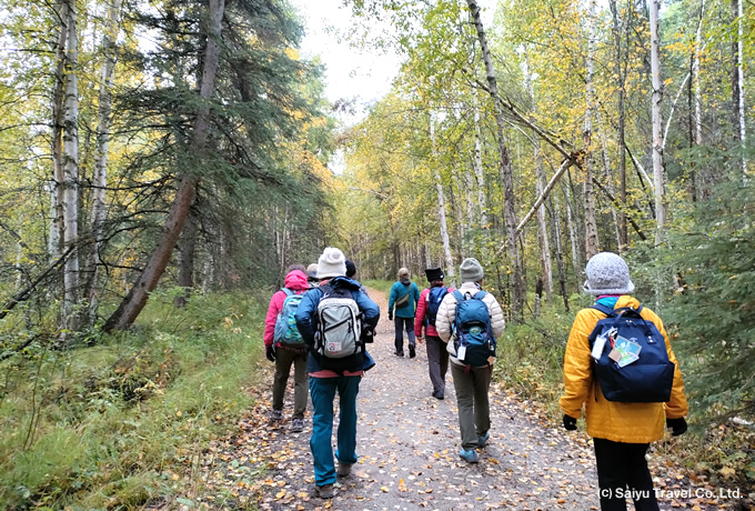 ツアーでは3箇所のハイキングをお楽しみいただきます。植村直己ゆかりの地・タルキートナでのデナリ展望ハイキング、デナリ国立公園でのホースシュー・レイクトレイル、フェアバンクス郊外の黄葉のエンジェルロックトレイル。また、チナ温泉リゾート付近の自然散策路を散策します。