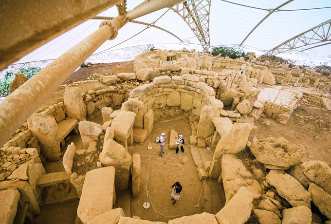 マルタとゴゾの両島で、人類最古の石造建築物といわれる先史時代の神殿の遺跡が30ヵ所発見されています。世界遺産に登録されたのはそのうちの6神殿で、マルタ島には南部のターシエン神殿、ハジャーイム神殿、イムナイドラ神殿、スコルバ神殿、タハージュラ神殿、ゴゾ島には紀元前3600~前3000年頃の建造と推定されているジィガンティーヤ神殿があります。これらの巨石を使った建造物は、シチリア方面から移住したステンティネロ文化人の手によるものではないかと推定されていますが、誰がどのような方法で巨石を運び、どのような方法で積み上げて造ったのかはよくわかっていません。また、これらの神殿は女神信仰のために造られたと推定されています。