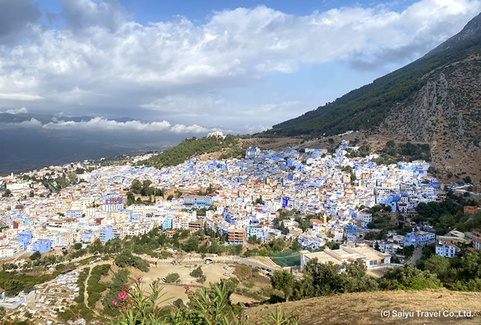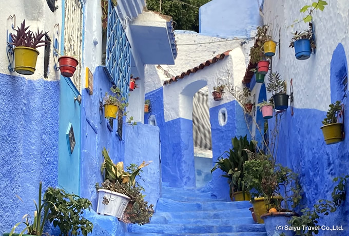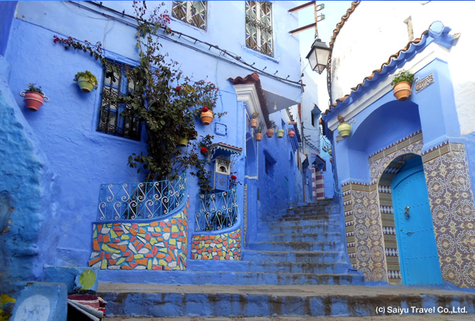 モロッコ リーフ地方の山中に突如と現れる青の迷宮都市 シャウエン。レコンキスタによって追われたイスラム教徒やユダヤ人がこの町に逃げ込み、家々を青く塗っていったことがその始まりとされています。真っ青なドア、入りくむ路地やアクセントのように彩られる花々、歩いているとまるでおとぎの国に迷い込んだかのように錯覚に陥ります。旧市街に位置するホテルに宿泊し、ゆっくりとシャウエン・ブルーの世界をお楽しみください。ひと気のない朝の散歩は最高のひとときとなることでしょう。