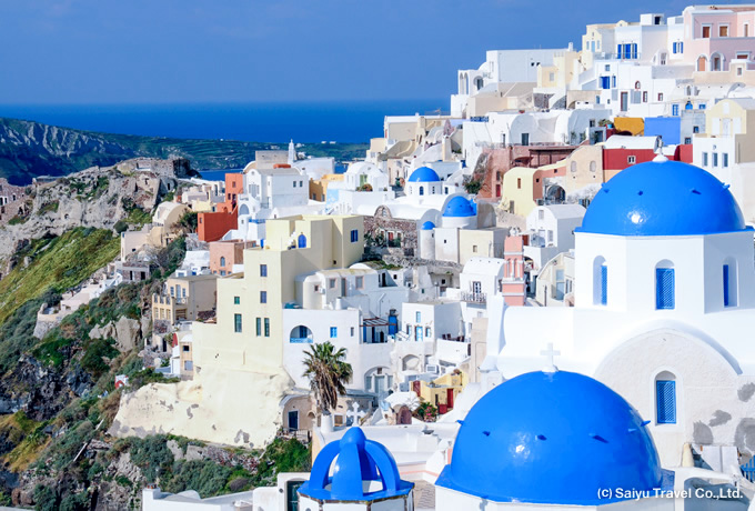 ドーハ到着後、航空機を乗り換えてアテネへ。着後、さらに国内線に乗り換え、キクラデス諸島のサントリーニ島へ。昼食後、紀元前の火山大噴火により町全体が灰に埋もれたアクロティリ遺跡を見学します。また、天候が許せばイアより世界的に有名な夕日をご覧いただけるでしょう。