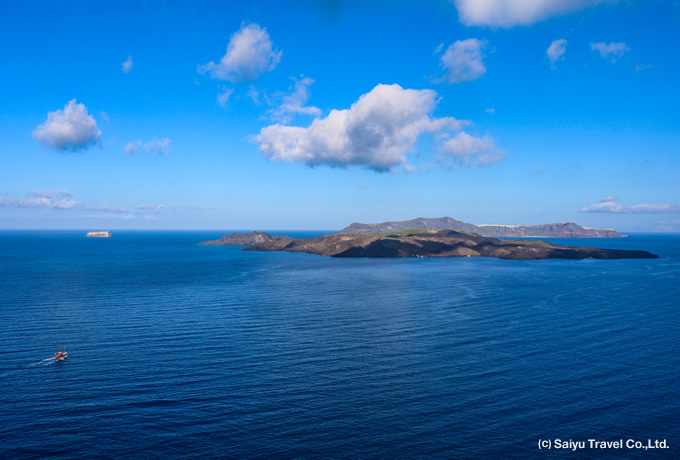 | 3 | サントリーニ島 | 午前、メサ・ヴーノ山へドライブし、島の高台にある古代ティラ遺跡を散策(約1.5時間)します。午後、半日火山クルーズ(混乗)に参加。島のカルデラの中央に位置する活火山島ネア・カメニ島に上陸し、火口付近までハイキングを楽しみます。また希望の方は湾内で、海底から湧き出る温泉での遊泳をお楽しみください。