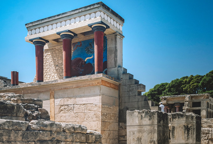 クレタ島に華開いたミノア文明は、紀元前2000年頃に頂点を極めたヨーロッパ最古の高度な文明です。その象徴であるクノッソス宮殿は、複雑な構造から「ラビリンス(迷宮)」の語源にもなりました。鮮やかな壁画「牛飛びの儀式」や、排水設備まで備えた高度な建築技術は、現代の私たちを圧倒します。本ツアーでは、クノッソスだけでなく、王の別荘ともいわれるファイストス宮殿や、謎多き「ファイストスの円盤」が眠るイラクリオン博物館も訪問。壮大な文明の興亡を、多角的な視点からじっくりと紐解いていきます。
