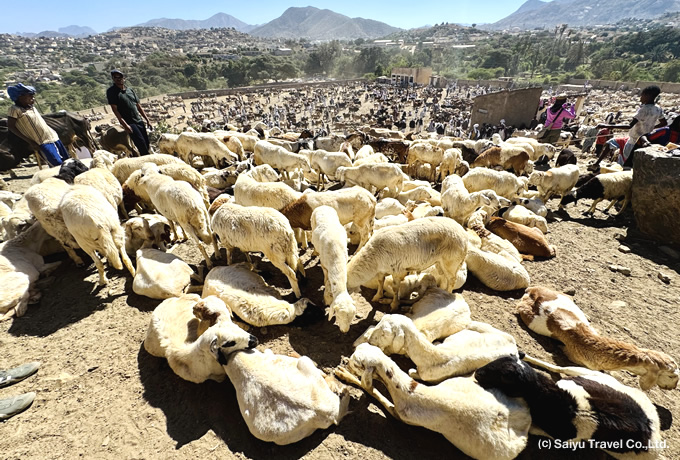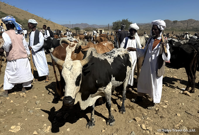 ケレンの月曜市は、毎週月曜日に開かれ、遠方の村々から3~4日もかけて100頭ものラクダが集まってきます。ラクダと共に、ヤギやヒツジ、コブウシも売られていました。野菜や日用品の露店も並びます。