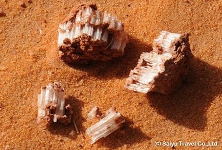 テゲディの塩田ウニャンガとはウニャス族の暮らす土地という意味。ティベスティ山地とエネディ山地の間にありおよそ50ほどの湖があります。この地域の水はチャド最高峰のエミクーシの地下から太古の水(完新生の雨が地下にたまったもの)が湧き出て、それが地表に現れたものです。夏は蒸発が激しく水位が下がります。