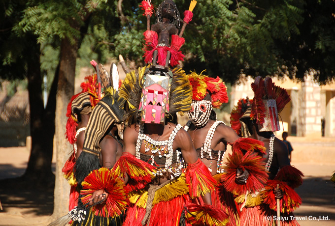 ドゴン族の仮面舞踊ジェンネはトンブクトゥとともにマリ帝国の「双子の姉妹」と呼ばれた都。ニジェール川の中州に位置し、トンブクトゥーとニジェール川をつなぎ食料を含む供給都市として栄え、最盛期のマリ、ソンガイ帝国の時代には11万の人口をかかえました。 現在は漁労民ボゾ族が暮らし、船の中継地となっています。毎週月曜日には市が立ち、かつての賑わいを現代に蘇らせます。 旧市街は世界遺産にも登録され泥で塗り固められた巨大なモスク等の建築物が見られます。