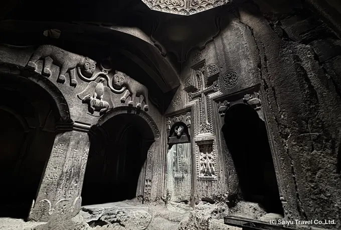 アザート渓谷の標高約1,700mに位置する修道院で、岩山を掘り抜いて造られた洞窟教会群で知られます。2000年にユネスコ世界文化遺産に登録されました。創建は4世紀初頭。聖グレゴリウスが、古来より聖地とされた洞窟の泉の上に修道院を築いたことに始まると伝えられます。当初は「アイリヴァンク(洞窟修道院)」と呼ばれていました。13世紀に最盛期を迎え、ザカリアン家の支援により現在の主聖堂や岩窟礼拝堂が整備されます。キリストが十字架上で刺されたとされる聖遺物「聖槍」が安置されたことから、「ゲガルト(槍)」の名で呼ばれるようになりました。920年代のアラブ軍、さらにモンゴルやティムール軍による侵攻で幾度も破壊されましたが、その都度再建され、写本制作や典礼音楽の中心地としてアルメニアの精神文化を支えました。