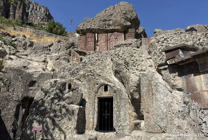 ゲガルト修道院の岩窟聖堂と岩壁に刻まれたハチカル