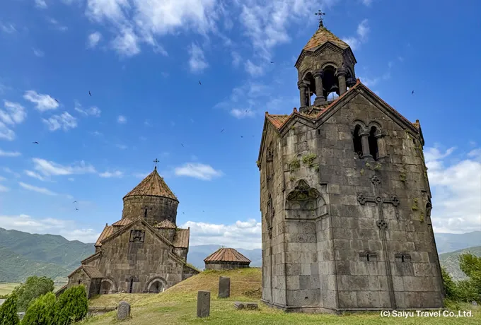 ノラドゥーズのハチカル群 アルメニア北部に位置するロリ地方は、ジョージアと国境を接する山岳地域で、深いデベド渓谷と緑豊かな景観が広がります。10〜13世紀にかけては中世アルメニア文化が花開いた中心地の一つであり、学問と宗教の拠点として重要な役割を担いました。渓谷を見下ろす高台には、アルメニア建築史における成熟期を代表する修道院群が残ります。