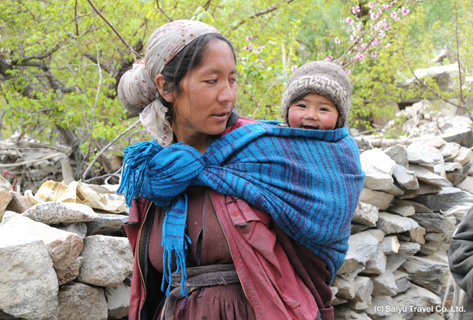 スクルブチャンの村にて外国人が通る事の出来る最後のチェックポストを越えるとすぐにダーの街に到着します。インダス川沿いの車道から集落の中心地までは10分ほどの上り道。本当にこの地域にだけ青々とした木々や果物、野菜が育っているのにびっくりすることでしょう。集落の一番奥には小さなゴンパが建っており、さらに奥には廃墟となった昔の城砦跡が残っています。ここから先、パキスタンの国境までは約20kmほどの距離しかありません。ダーの集落にはラダッキやザンスカーリーとは異なる、ドロクパと呼ばれる青い目と彫の深い顔が特徴の人々が住んでいます。周囲に比べ標高も低いため、お野菜や果物が豊富に採れ、毎日新鮮な花を頭に飾りとして付けるのがこの地の人々の特徴です。