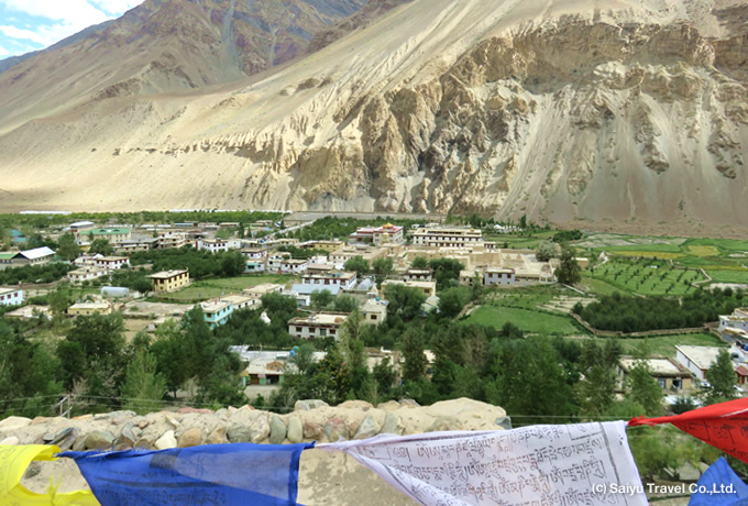 ゴンパとスピティ谷の美しい景観キ・ゴンパから先へ山道をどんどん入っていくと、「世界で一番標高の高い村」と呼ばれているキッバル村やゲテ村に到着します。ゲテ村の手前からしばらく歩くと標高差300m以上はあろうかという絶壁に出ます。タルチョはためくこの場所は、キ・ゴンパを真上から眺められるポイント。美しいスピティ川や荒れ果てた岩肌、頂上に残る雪などの光景を望むことが出来る絶景ポイントでもあります。