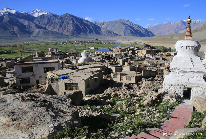 チョージグザル僧院パドゥムから北へしばらく走ると驚くほどきれいに舗装された道に入ります。この道を走り約1時間。パドゥムから続く自動車道路の現時点での最終地点がザンラの集落です。 ザンスカールの歴史はパドゥム王家とザンラ王家の2つの王家が中心となって育まれてきました。このザンラの街には現在でも王様が住んでおり、そのお住まい(ザンラ・カル)を訪れる事が出来ます。現在はなぜか二人の王様がいらっしゃるのですが、本物の王様がお住まいの家の屋上には王家の宝物庫が建てられています。 現在のザンラの中心地から山の方に登って行くと、遠くに土壁の巨大な建物が見えてきます。これがザンラの旧王宮。この昔の王宮はすでに建設から数百年が経過しており、足元は非常に危険な状態になっています。床が抜けないようにゆっくりと気をつけて歩きましょう。旧王宮の中にはハンガリー人のアレクサンダー・チョーマ・ド・ケーレスという人物が住んでいた部屋も残されています。この王宮の入り口に至る道沿いには無数のストゥーパが立ち並んでいます。また、王宮を通り過ぎしばらく先へ走ると王室にゆかりのある小さな洞窟寺院が建っています。