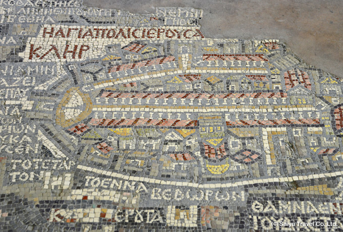 高原地帯から高度を下げて死海へ。マイナス420m地点の死海アンマンから南へ30km。聖書の時代には「水の流れの多い」という意味のメデバと呼ばれ、洗礼者ヨハネが布教活動を行った場所でもあります。マダバで最も有名なのは聖ジョージ教会で、6世紀に造られたとされるモザイク地図が残っています。世界最古の古代パレスチナ地図と言われ、聖地エルサレムの旧市街は城壁や門などが細かく描かれ、その他にも魚が泳ぐヨルダン川、ナツメヤシが茂るエリコなど聖書の時代を今に伝える貴重な資料となっています。