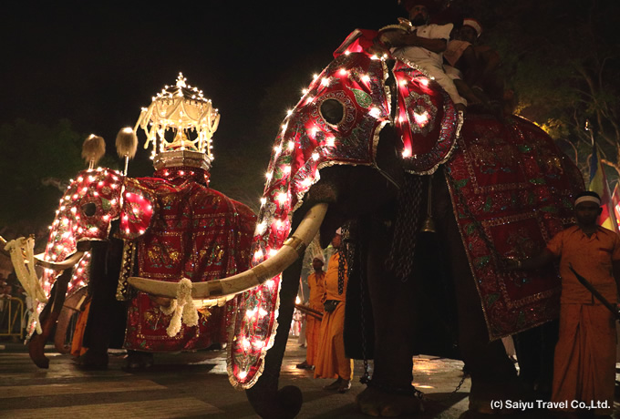 スリランカを代表する芸能。各地の民族舞踊が組み込まれており、男性ダンサーの迫力あるアクティブな動きや、女性ダンサーのしなやかな仕草と鮮やかな衣装に思わず目を奪われます。現在はお祭りや結婚式で登場しますが、もともとは「コホンバ・カンカーリヤ」という宗教儀礼から始まったもの。王朝時代に、健康、繁栄、病気よけを目的とする祭りの際に宮廷で行われた儀式で、最大の目的は悪霊払いでした。その由来となった伝説があります。始まりはスリランカ建国の王ヴィジャヤがインドからやってきたこと。ヴィジャヤはこの地の鬼神である女夜叉クウェーニィと結ばれ、クウェーニィの助けによって王位に就きます。しかし、後にヴィジャヤはクウェーニィを裏切ります。怒ったクウェーニィは、豹になり宮廷を襲います。二代目の王パンドゥワス・デーウァをも、悪霊の崇りで病気にさせました。そして、インドの王、マラ王がスリランカに招かれて見事に病気を治したといいます。この一連の出来事を再現したものが「コホンバ・カンカーリヤ」です。かつては七日七夜にわたって行われていましたが、現在は少なくなり、宗教儀礼ではなくショーのようなダンスとして残されるようになりました。ショーとはいえダンスは神聖なもの。「コホンバ・カンカーリヤ」の名残が衣装・装飾に残されているという説があります。メインの踊り手は12~13mの紅白の布を腰に纏い、頭にウェスタットゥワという飾りを被ります。胸には華やかなビーズの飾り、耳輪、ブレスレット、音が鳴る足輪、さらに腰布の上に金属製のベルトを巻いています。この姿が、儀礼の崇拝対象であった太陽神を表している、または儀式の主宰者である王の姿であると伝えられています。